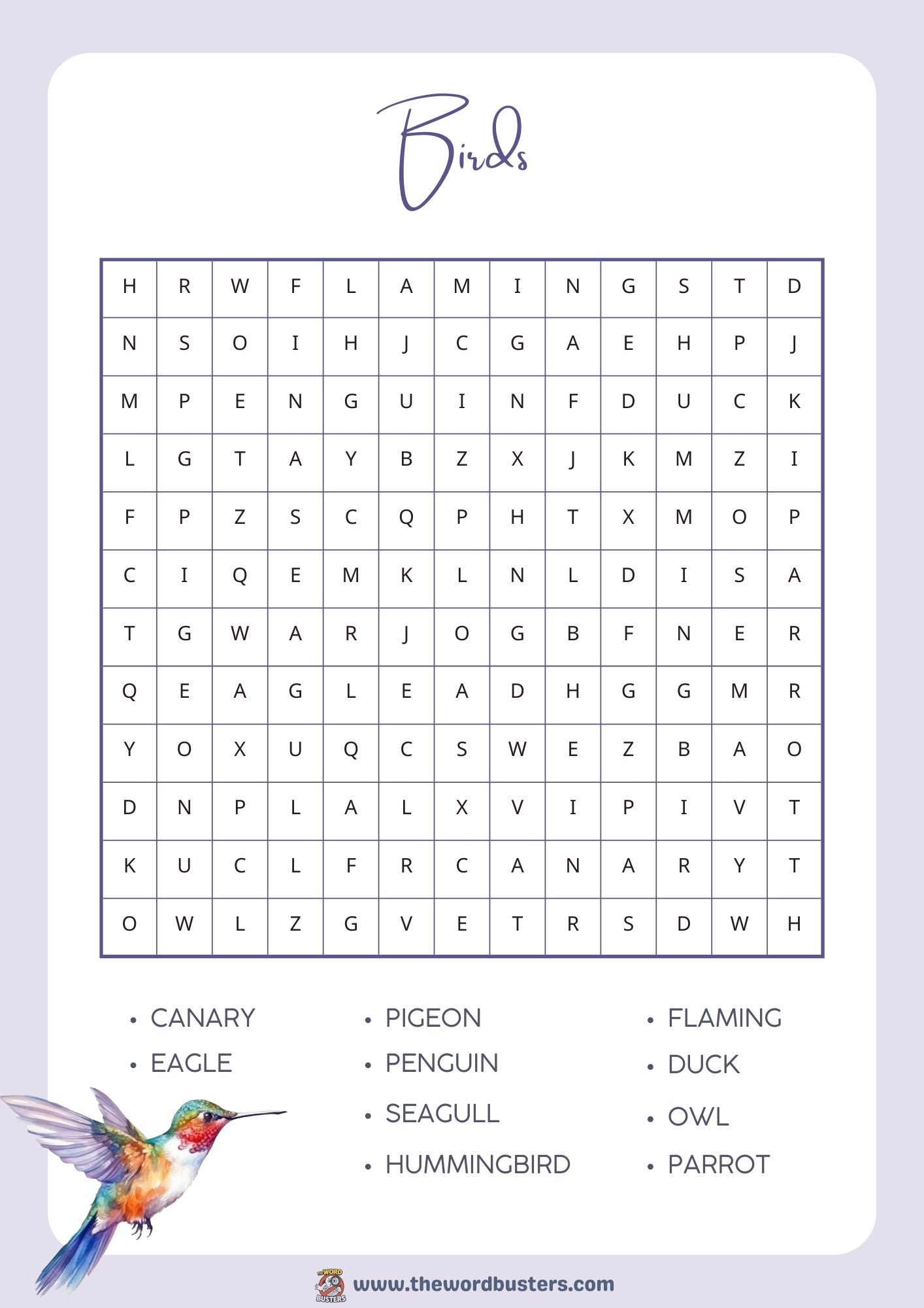 Fly high with this beautiful bird word search puzzle! With 10 bird names to find. This free printable is both educational and entertaining. To continue browsing, explore the options we offer below.