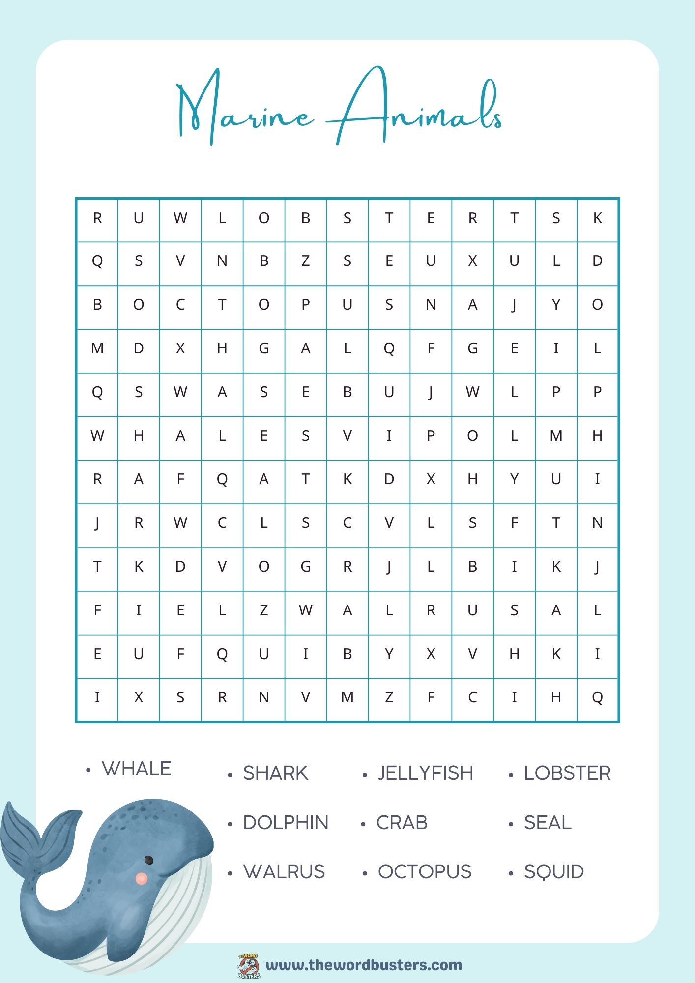 Explore the wonders of the ocean with this marine animals word search puzzle. Featuring 10 sea creatures , this printable is perfect for reinforcing ocean vocabulary and nature themes in a fun way. For more content, explore the options we offer below.