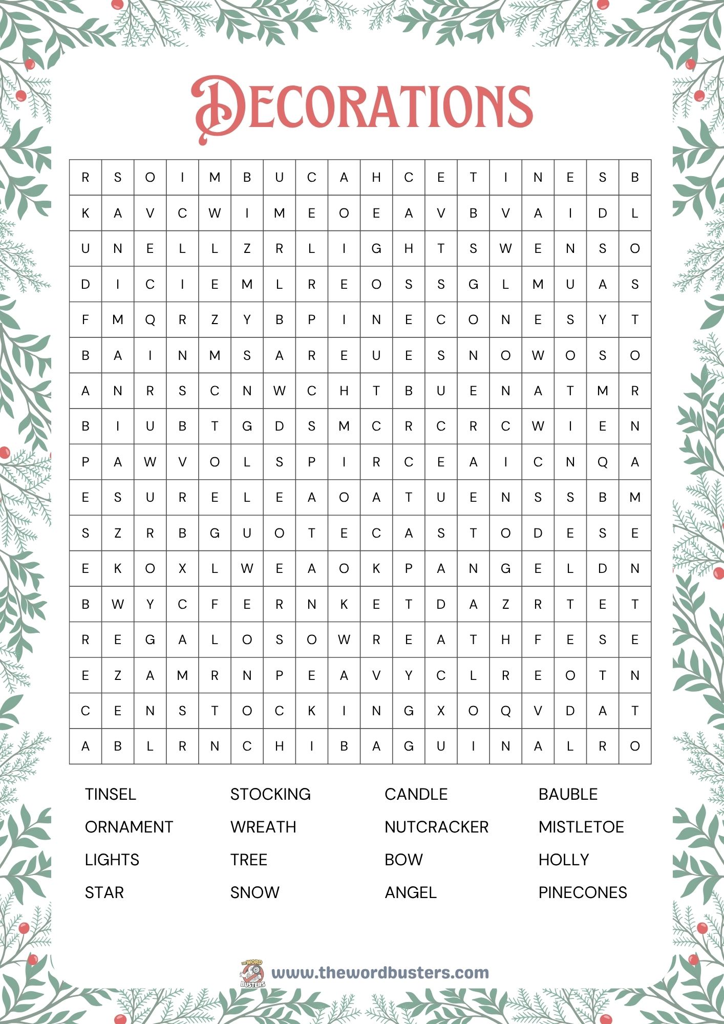 Christmas Decorations word search free printable PDF