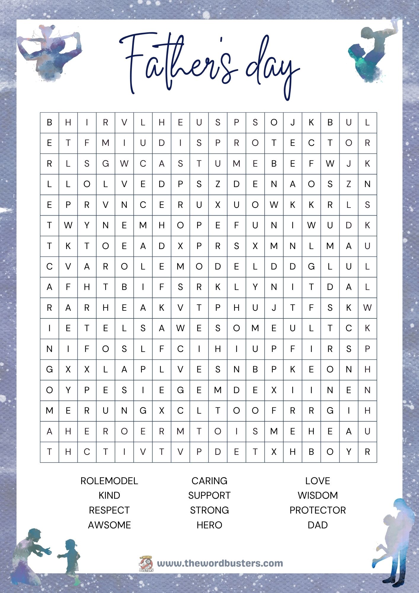 Enjoy this thoughtful Father's Day word search printable featuring words like hero, kind, love, and role model. For more content explore the options we offer below.
