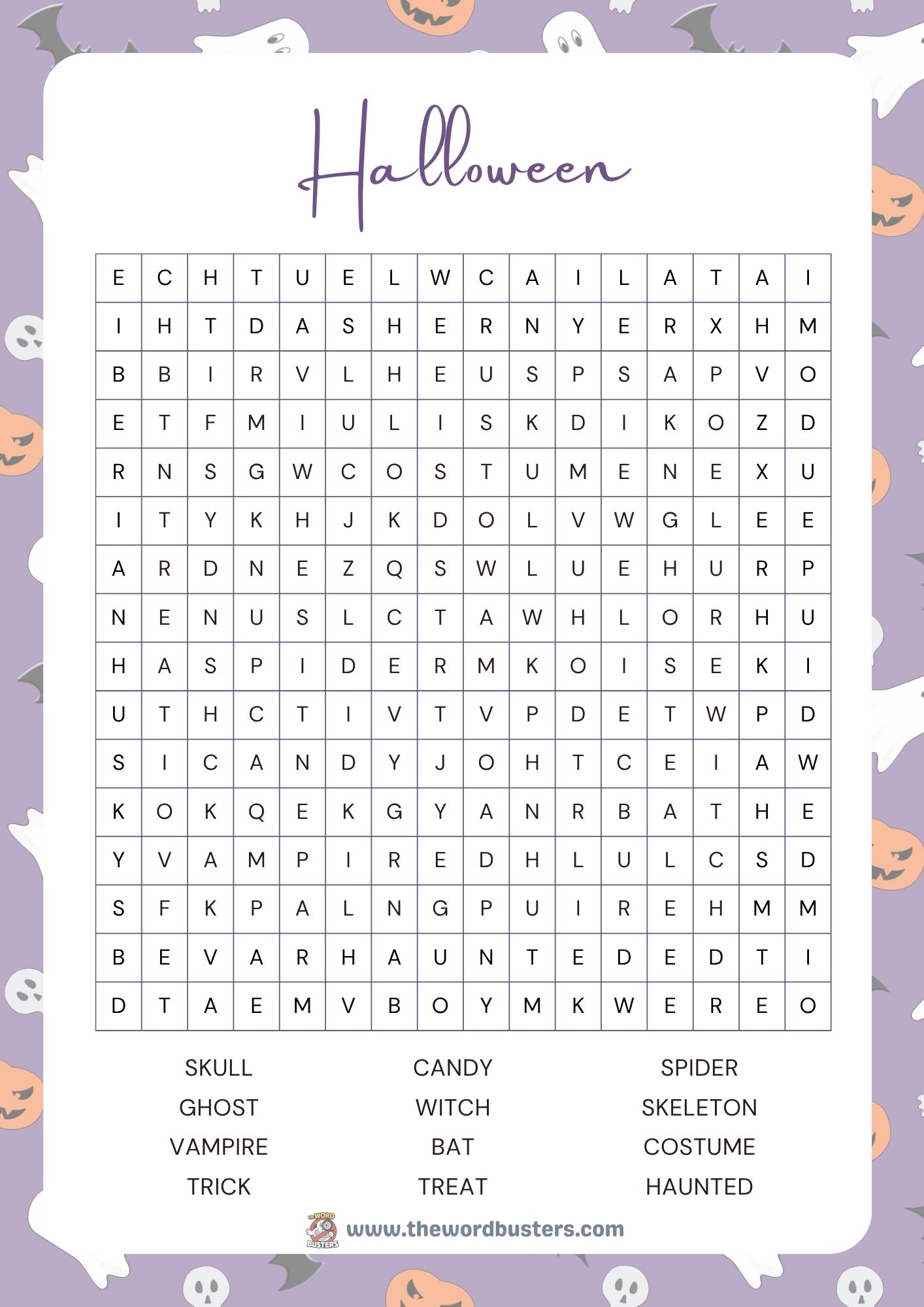 Celebrate the spooky season with this fun and free Halloween word search! Find creepy words like ghost, vampire, spider, and witch. For more content explore the options we offer below.