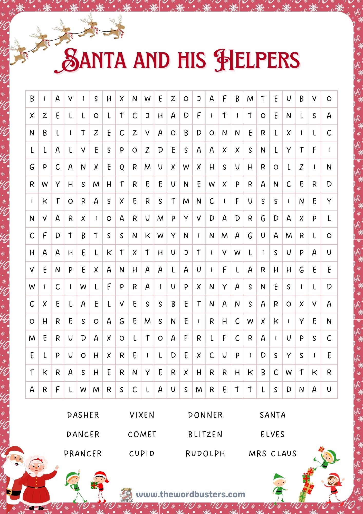 Celebrate the holidays with this cheerful Santa and his helpers word search game printable. Find words like Santa, cupid, donner, and elves. For more content explore the options we offer below.