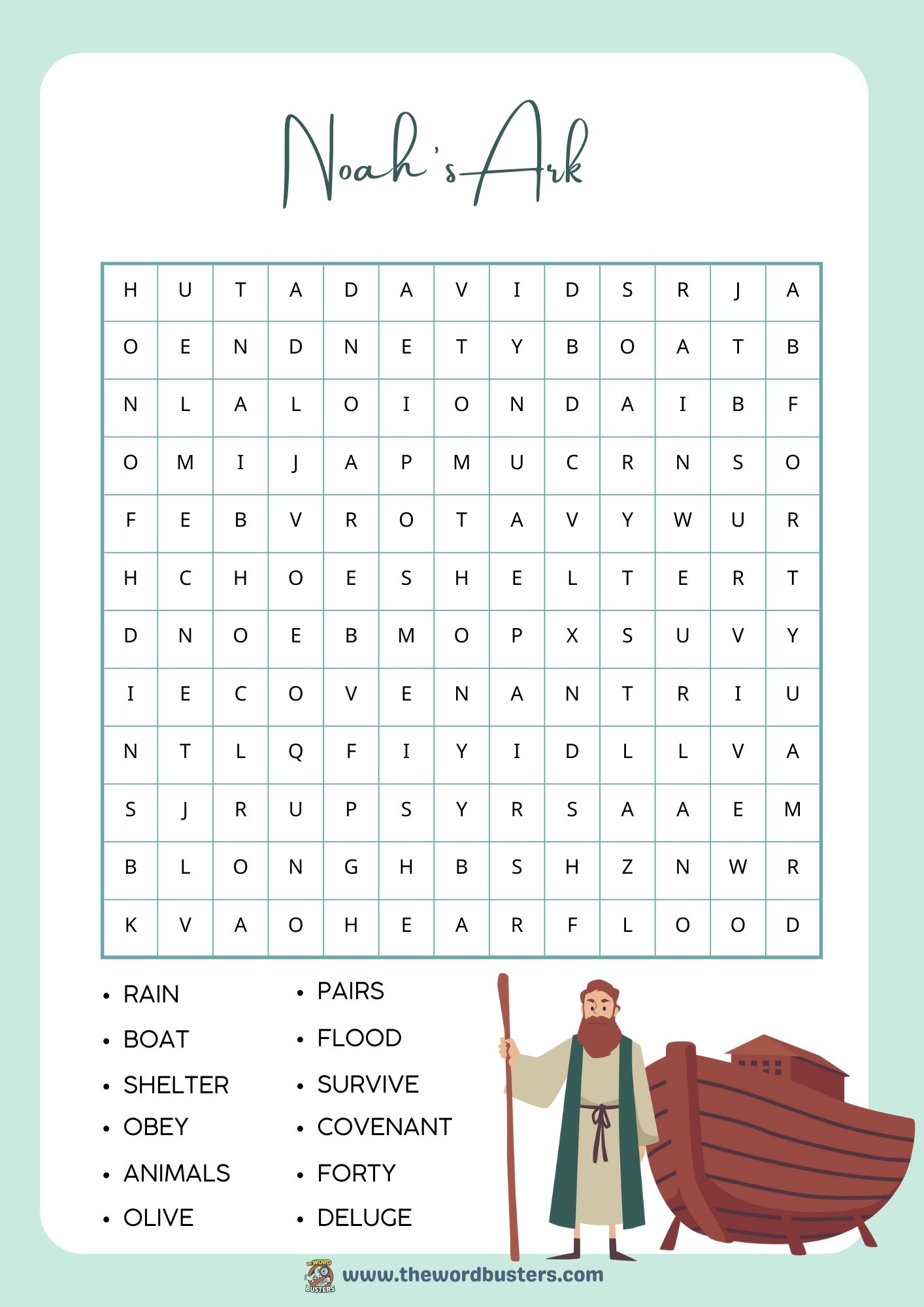 Teach the story of Noah’s Ark with this printable word search game. Featuring words such as rain, boat, flood, animals, covenant, and shelter. Download and print for free. For more content explore the options we offer below.