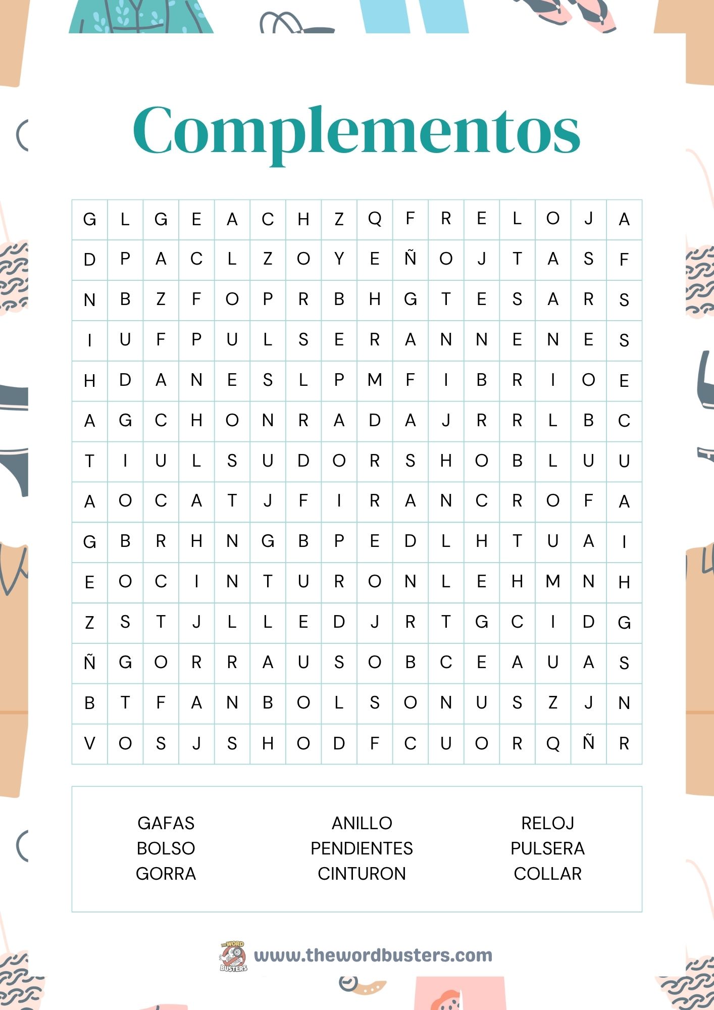 This Spanish accessories word search helps you recognize items like gafas, reloj, and cinturón while expanding your vocabulary in a fun way!. For more content explore the options we offer below.