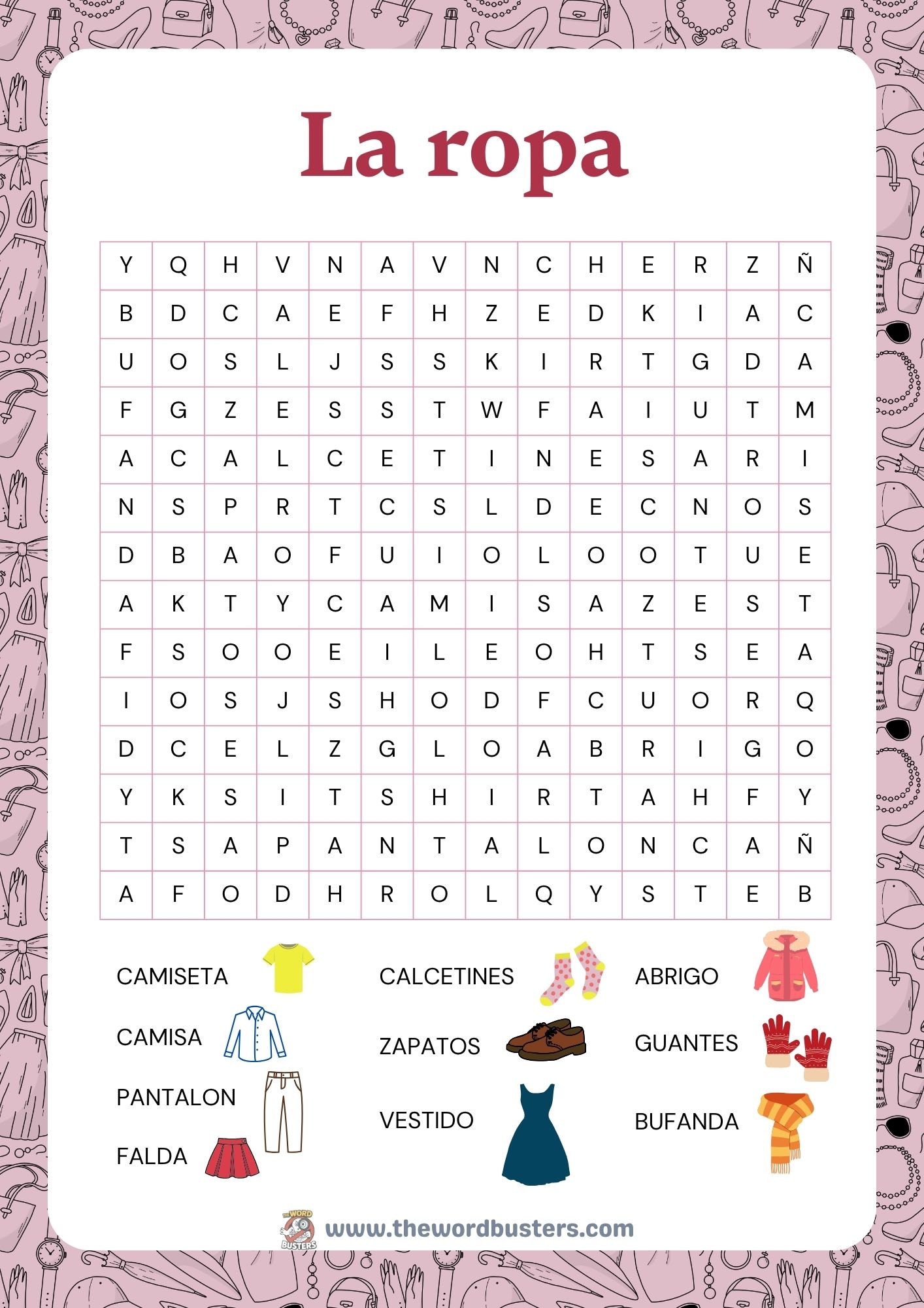 Practice your Spanish clothing vocabulary with this interactive word search. Find everyday items like camiseta, falda, zapatos, and abrigo while boosting your language skills! For more content explore the options we offer below.